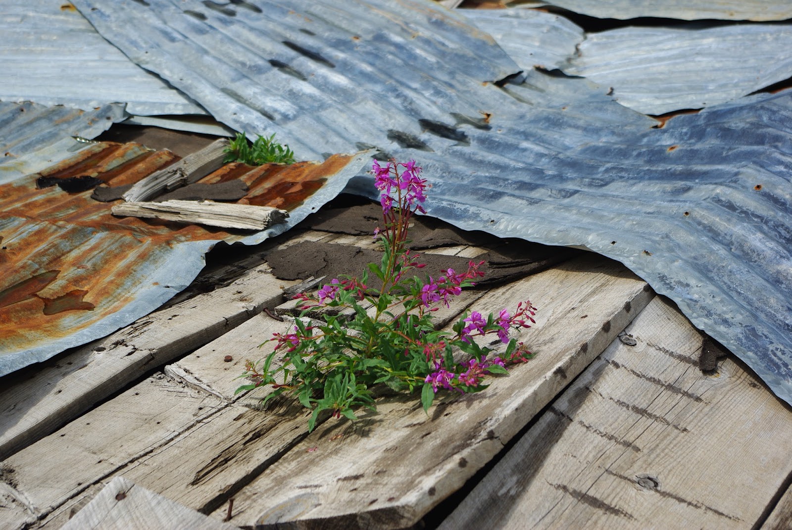 Near the top was an old mine with the remains of a fallen cabin that had a tin roof and not sure how this wildflower got through it all.